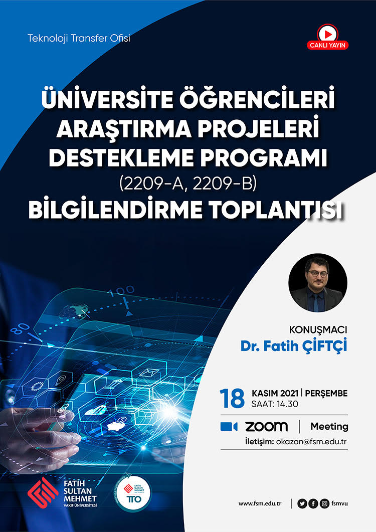 18 Kasım 2021 Perşembe - 14:30'da Dr. Fatih Çiftçi tarafından "Üniversite Öğrencileri Araştırma Projeleri Destekleme Programı (2209-A, 2209-B)" hakkında Zoom üzerinden bilgilendirme toplantısı yapılacaktır.