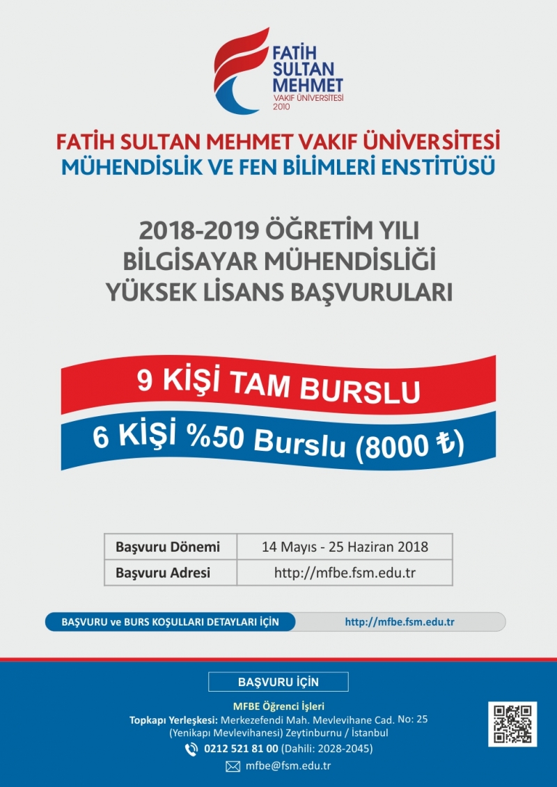 Bilgisayar Mühendisliği Lisansüstü başvurularımız başlamıştır. 14 Mayıs - 25 Haziran 2018 tarihleri arasında başvurularınızı Mühendislik ve Fen Bilimleri Enstitümüze yapabilirsiniz.