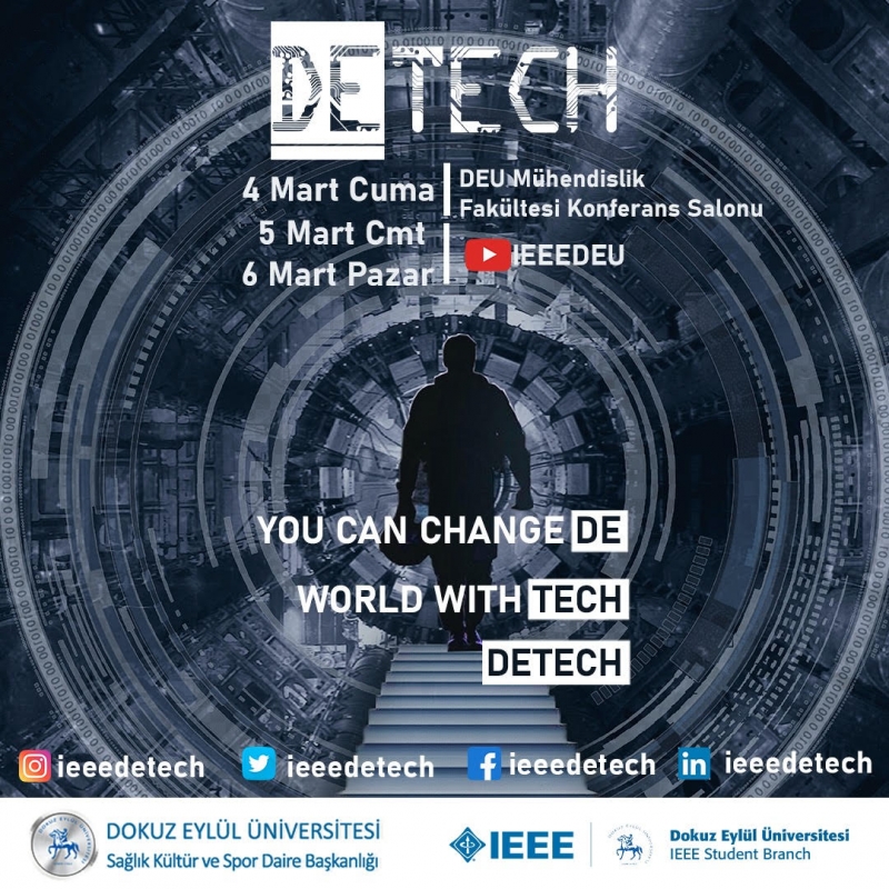 IEEE Dokuz Eylül Üniversitesi Öğrenci Kolu tarafından bu sene beşincisi düzenlenen DETECH (Dokuz Eylül Teknoloji Konferansı), 4-5-6 Mart tarihlerinde gerçekleştirilecektir. Etkinlik, 4 Mart Cuma günü DEU Mühendislik Fakültesi Konferans Salonunda, 5-6 Mart günleri IEEEDEU YouTube kanalında canlı yayında yapılacaktır. Alanında öncü teknoloji şirketleri ve uzman konuşmacılarımız ile özellikle mühendislik fakültesi öğrencileri için verimli bir konferans gerçekleştirilecektir.