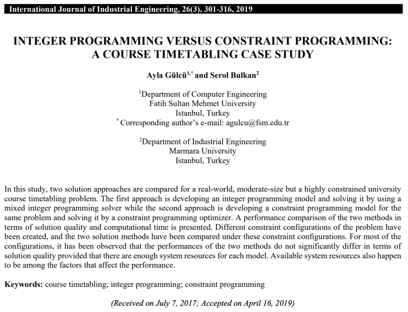 - Ayla Gülcü, Serol Bulkan (2019), “Integer Programming versus Constraint Programming: A Course Timetabling Case Study”, International Journal of Industrial Engineering: Theory, Applications and Practice – IJIETAP, 26(3), 301-316. - SCIE