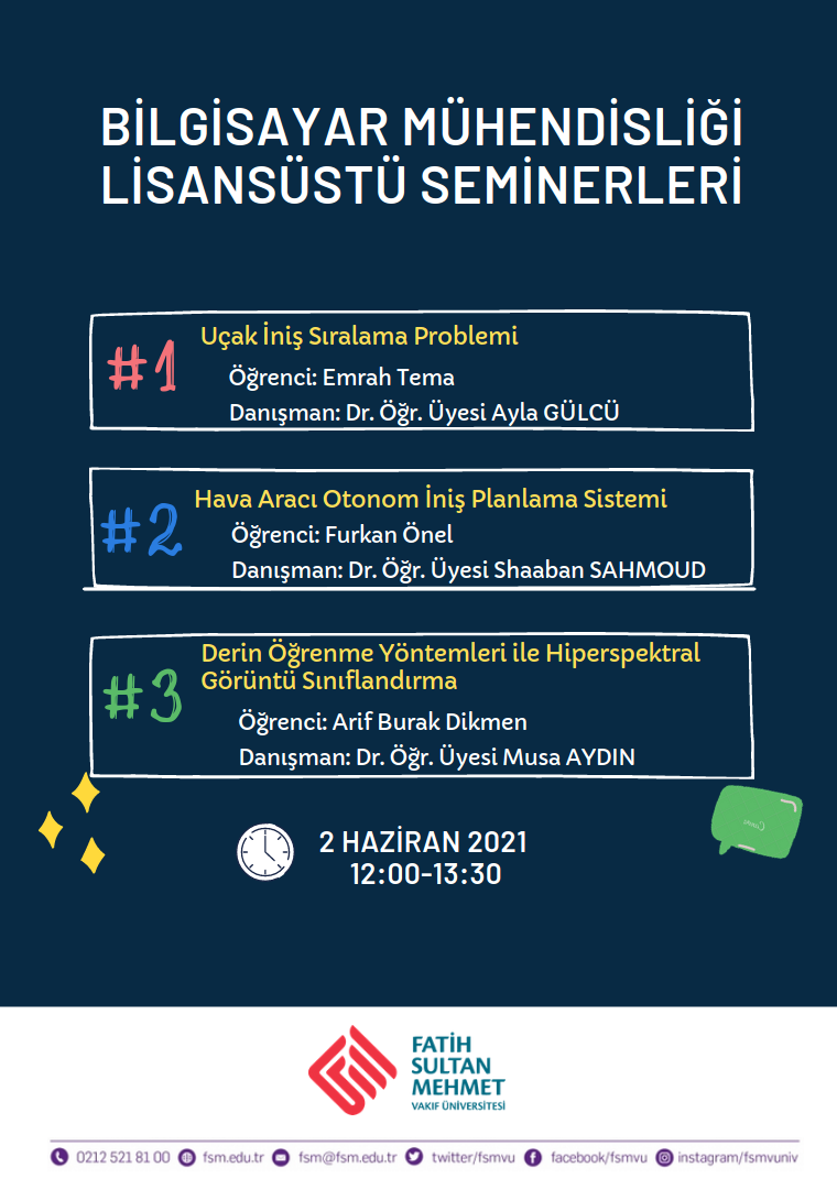 Bilgisayar Mühendisliği Anabilim Dalı Lisansüstü öğrencileri seminer dersi kapsamında yapmış oldukları araştırmaların sunumlarını 2 ve 9 Haziran tarihlerinde gerçekleştirecektir. Sunumlar 20 dakika olup, 10 dakika soru-cevap kısmı olacaktır. Seminer takvimi ve Zoom bağlatı bilgileri aşağıdaki gibidir: