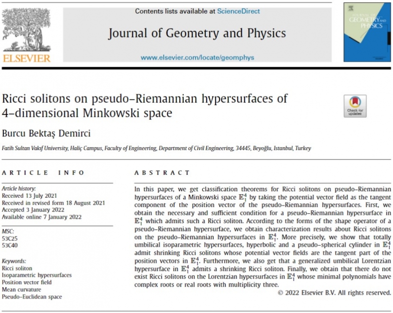 Bölümümüz öğretim üyelerinden Dr. Öğr. Üyesi Burcu Bektaş Demirci'nin, "Ricci solitons on pseudo-Riemannian hypersurfaces of 4-dimensional Minkowski space" isimli çalışmaları SCI indeksli "Journal of Geometry and Physics" dergisinde yayınlandı.
