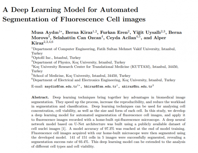 Üniversitemiz Bilgisayar Mühendisliği bölümünde görev yapan Dr. Öğr. Üyesi Musa Aydın ve Dr. Öğr. Üyesi Berna Kiraz'ın, "A Deep Learning Model for Automated Segmentation of Fluorescence Cell images" isimli konferans makaleleri Journal of Physics'de yayınlandı.