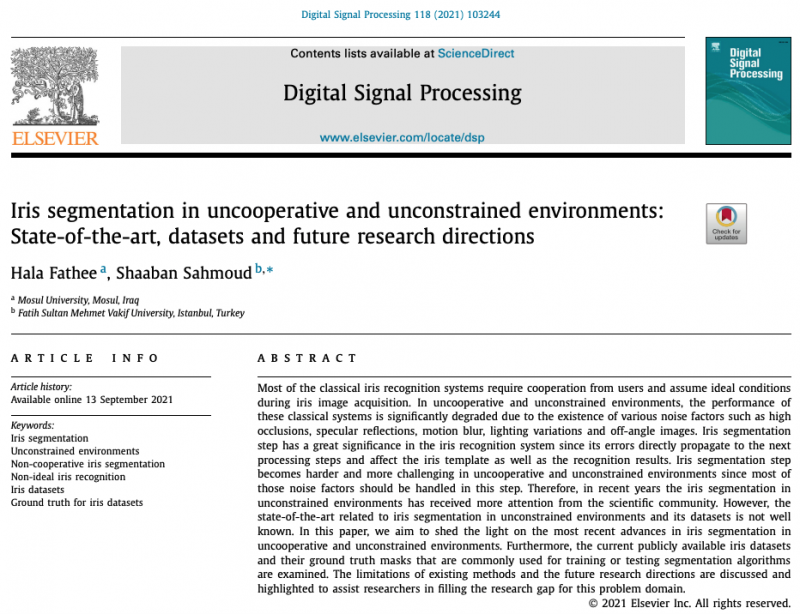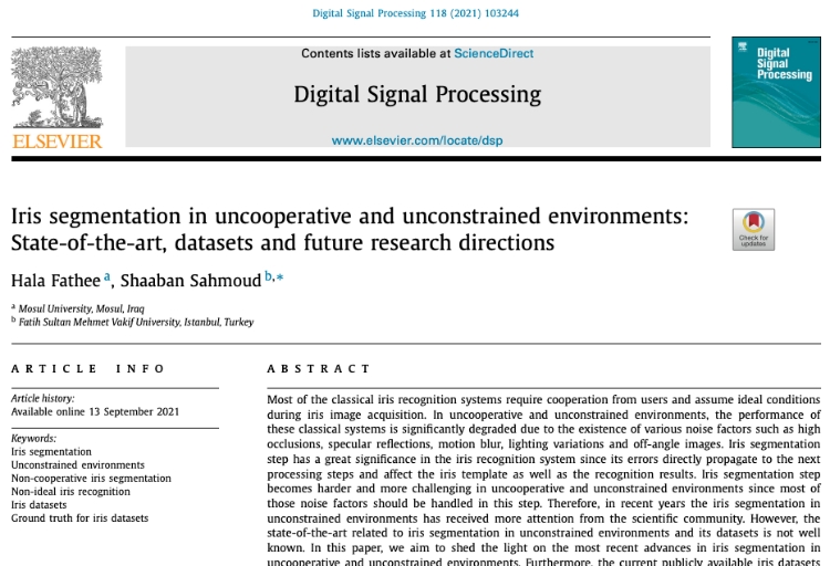 Üniversitemiz Bilgisayar Mühendisliği bölümünde görev yapan Dr. Öğr. Üyesi Shaaban A.I. SAHMOUD, SCI-E kapsamında yayın yapan "Digital Signal Processing" dergisinde "Iris segmentation in uncooperative and unconstrained environments: State-of-the-art, datasets and future research directions" isimli çalışmalarını yayınladı.